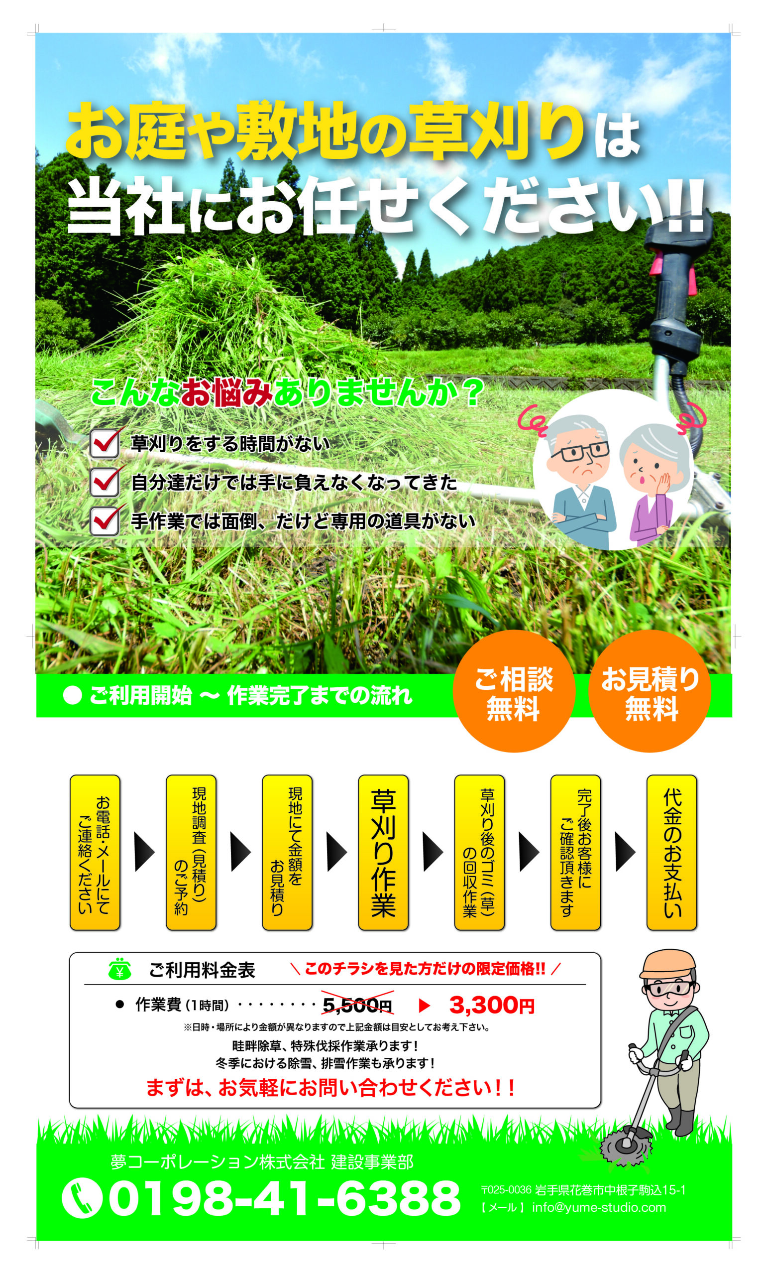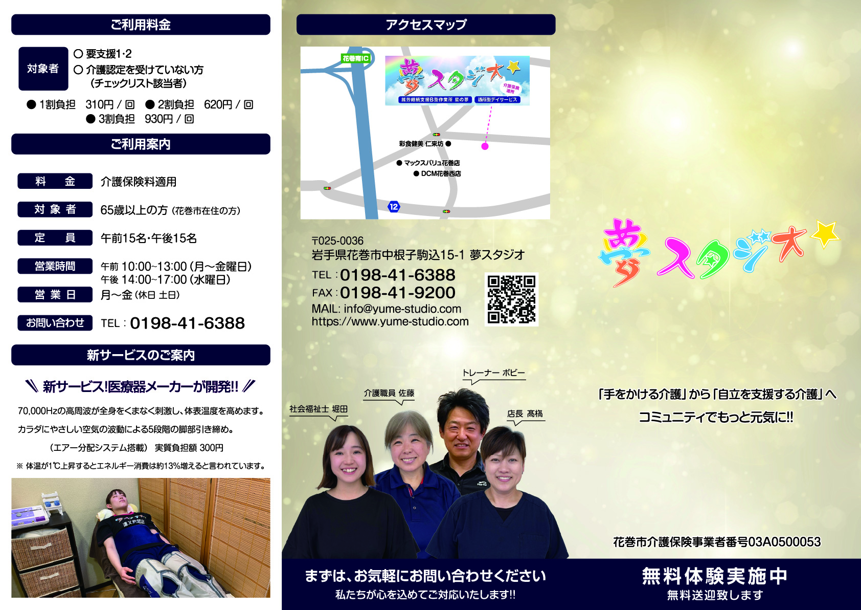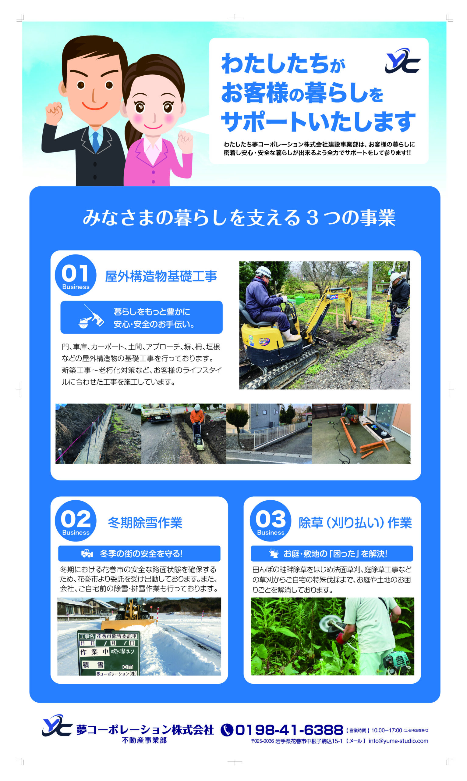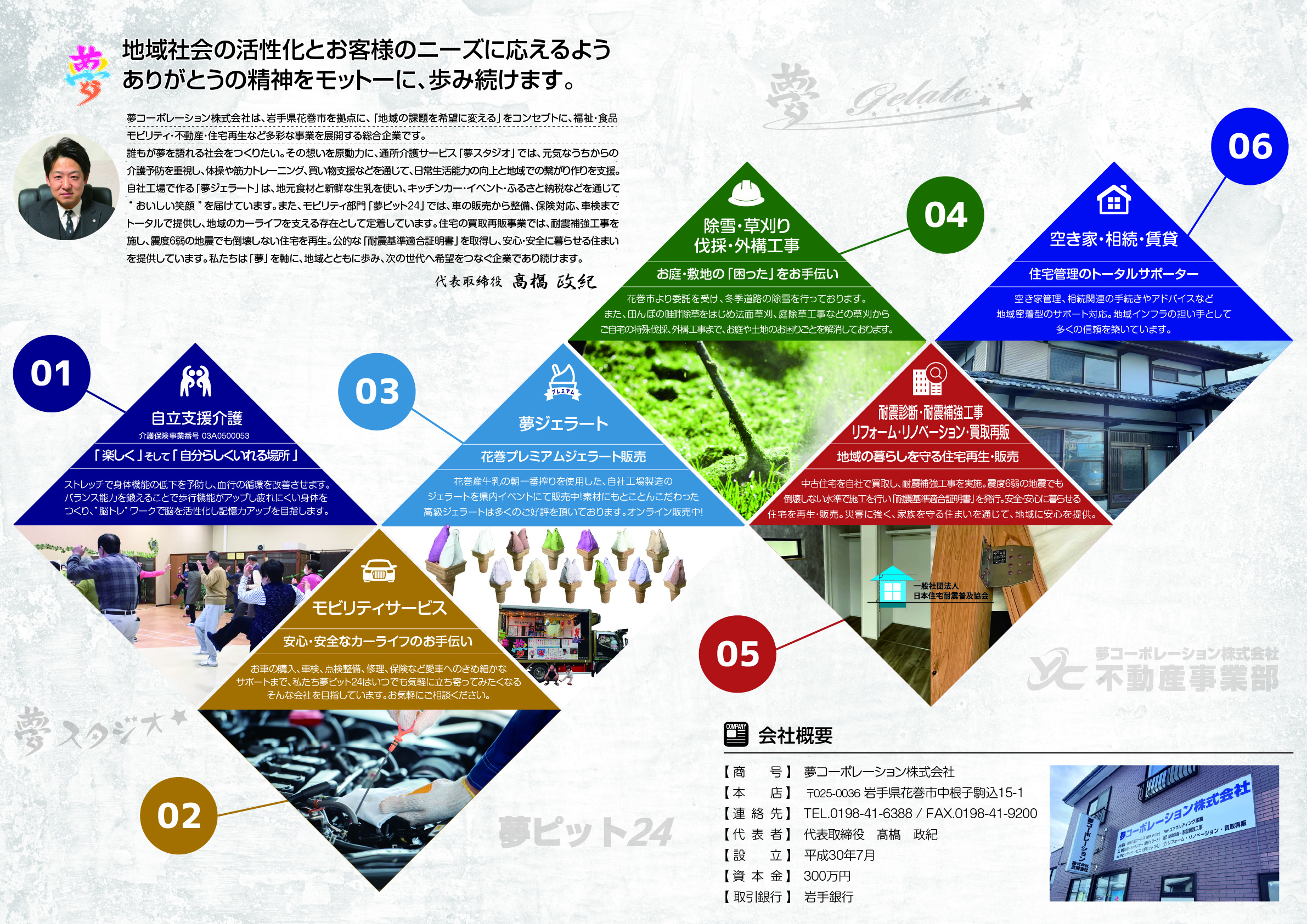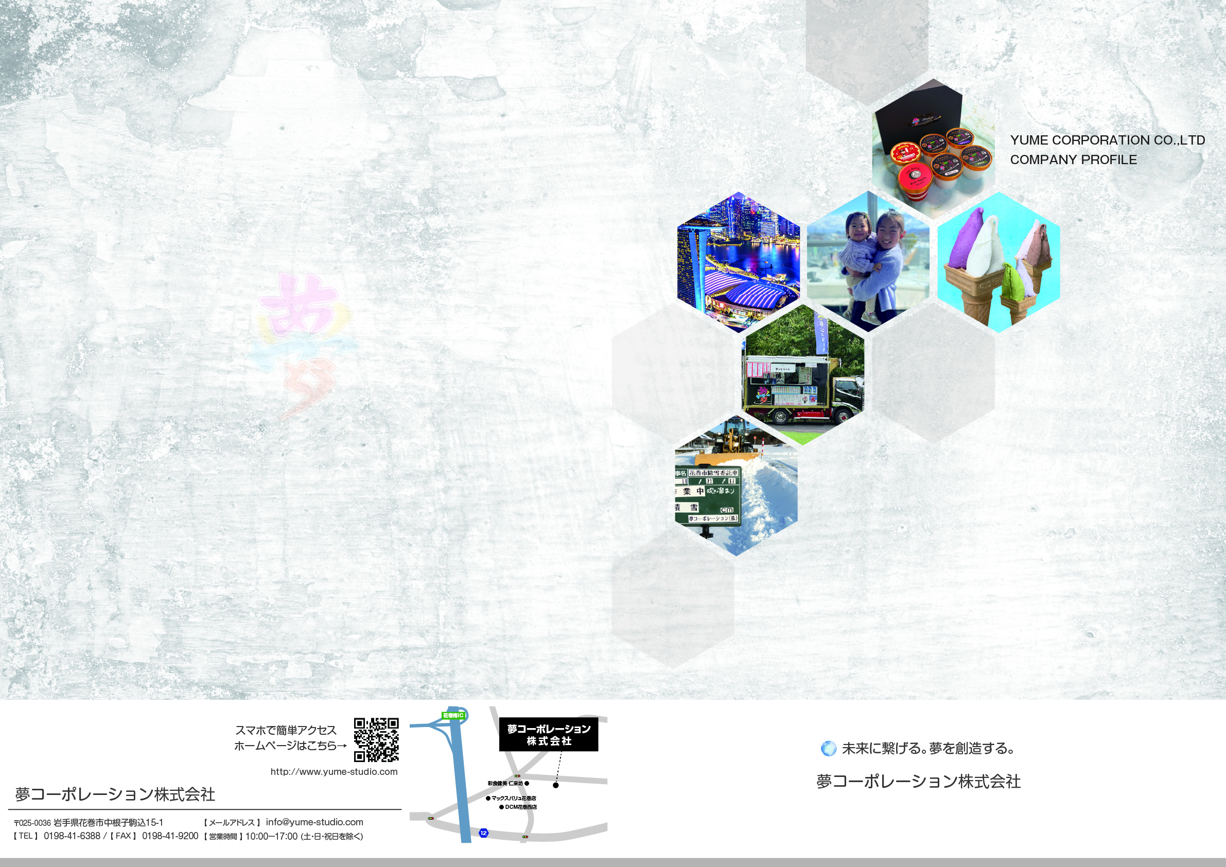 夢コーポレーション㈱広告一覧(2026年度版) 夢コーポレーションでは定期的にチラシ・パンフレットを作成・配布し周知して頂けるよう心がけております。 夢コーポレーションでは定期的にチラシ・パンフレットを作成・配布し周知して頂けるよう心がけております。 会社パンフレット 夢スタジオパンフレット